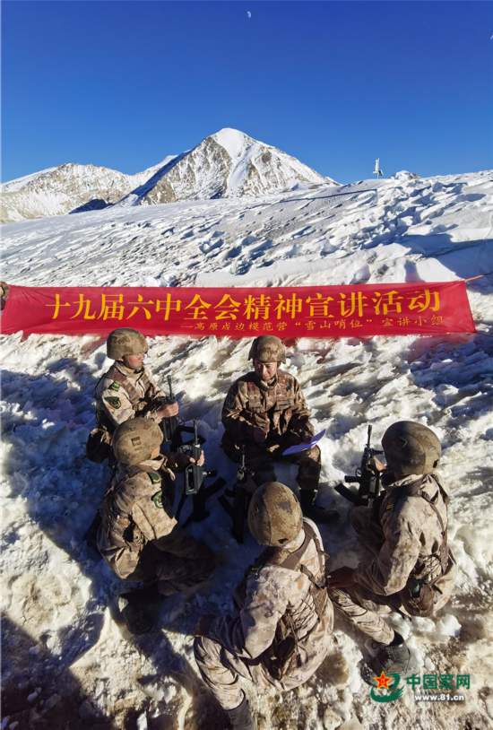 西藏軍區某邊防團崗巴邊防營官兵在海拔5592米的雪山哨所學習十九屆六中全會精神。馬三成攝