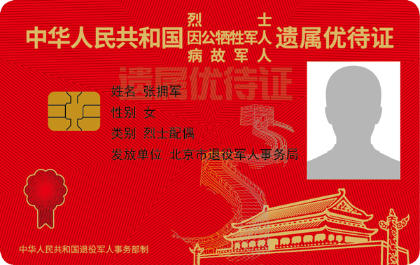 圖為中華人民共和國烈士、因公犧牲軍人、病故軍人遺屬優待證式樣圖。退役軍人事務部供圖