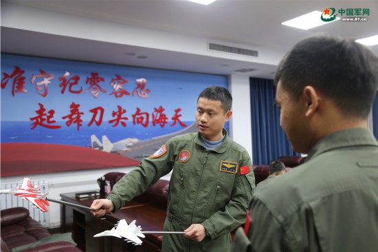 海軍航空大學某基地飛行訓練間隙,飛行教官梁李彬(左一)正在為學員講授編隊飛行方法。周剛 攝