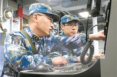 戰斗升溫,“敵”海上支援兵力悄然出動,伺機發起偷襲。艦艇作戰指揮室內,官兵目光緊盯顯控臺。伴著鍵盤敲擊聲,“敵”情飛速傳至各個作戰單元。指揮員沉著應對戰場態勢,指揮艦艇快速機動占領有利陣位,通過修正戰斗航向牢牢鎖定“敵”艦方位,做好導彈攻擊準備。