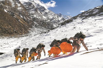 上圖:該連物資運送小分隊徒步往崗拉哨所送年貨。張照杰攝