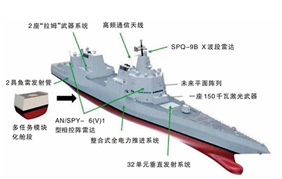 DDG(X)基線版本的武器系統并無新意,包括Mk41導彈垂直發射系統、Mk45型127毫米主炮和21聯裝“拉姆”武器系統。垂直發射系統共有96個發射單元,采用前部32單元、中部64單元方式布置。未來版本武器系統將有較大變化。其中,前部32單元垂直發射系統將被12單元高超音速武器系統發射裝置替代,另外增加一部150千瓦激光武器,艉部的2座“拉姆”武器系統也將被2套600千瓦的激光武器取代,從而實現全激光武器反導設想。