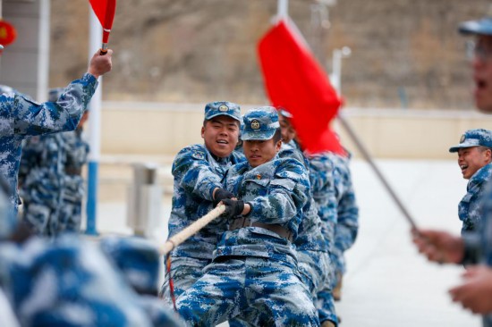 此時的操場上,“加油”聲此起彼伏。各連之間拔河、滾輪胎、攀繩、籃球等比賽正在進行!肮澣掌陂g,組織大家練練體能,運動一下!标惱仔χf,“今天冬奧會開幕,雖然我們這兒沒有下雪,但大家對體育的熱情一點兒不減,也是在雪域高原聲援我們的冬奧健兒!