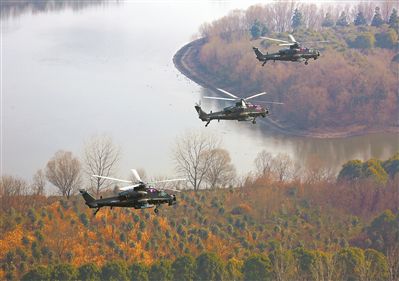 第72集團軍某陸航旅組織直升機超低空編隊飛行訓練,錘煉部隊實戰能力。