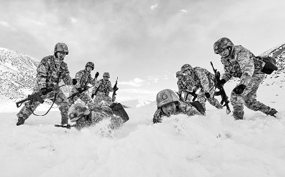 駐守在西藏阿里高原的阿里軍分區某邊防團官兵在雪地進行戰術比武。新華社發