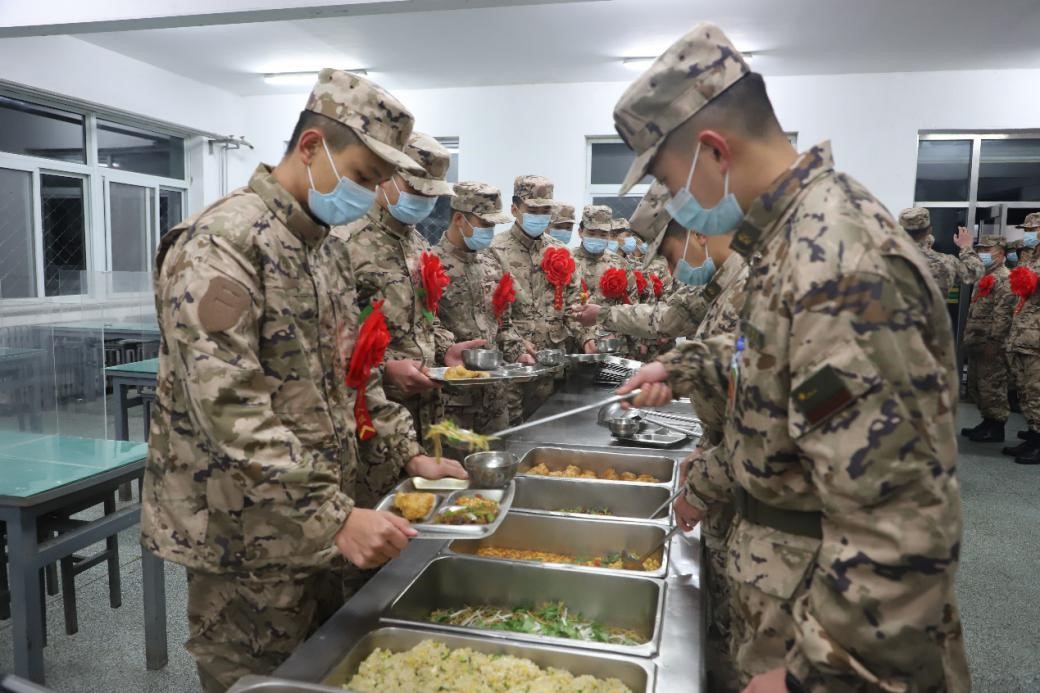 炊事班特意為新戰友準備了可口的飯菜。吃著軍營美食,新兵們臉上露出了幸福的笑容。