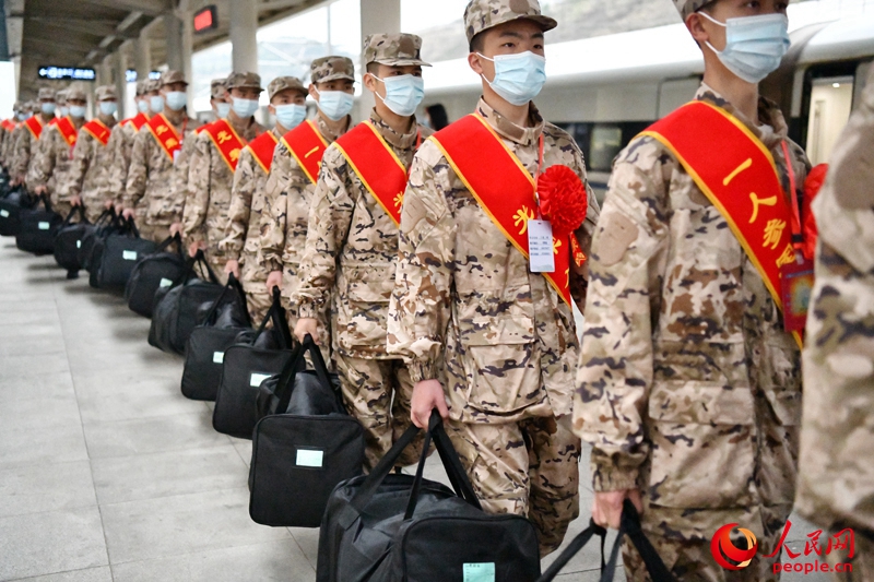 在貴州省銅仁高鐵南站,整齊劃一的星空迷彩,組合成了一道靚麗的風景線。起運新兵身著嶄新的戎裝,肩披綬帶、胸戴紅花,身姿挺拔、精神昂揚。
