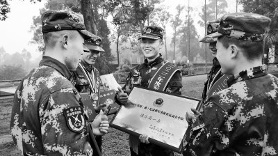 武警四川總隊樂山支隊的官兵們,分享參加2022年度創(破)紀錄暨軍事體育運動會取得的榮譽。李華時攝/光明圖片