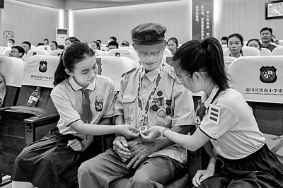 在山東省淄博市淄川區實驗小學,老兵正在給小學生講述軍功章背后的故事。翟慎安攝/光明圖片