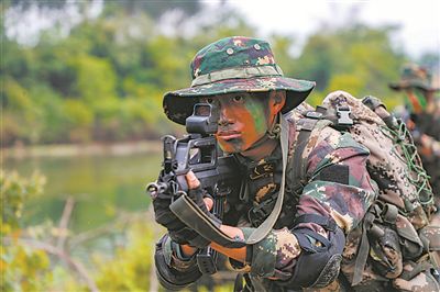夜幕降臨,一種危機四伏的緊張感和壓迫感,在叢林中蔓延開來。官兵們戴上夜視儀在林中穿梭,衣服與樹葉摩擦發出輕微的窸窣聲。