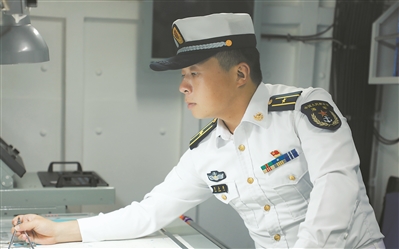 圖③:參加海上演習時,羅占亞緊盯顯示屏上的?漳繕藙討B。