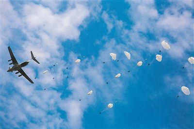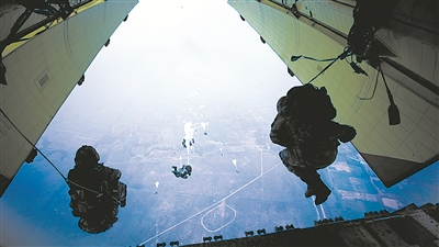 “01,投下!” 依據先期滲透到“敵”后的偵察分隊傳回的氣象資料和偵察信息,機艙綠色信號燈開始閃爍,投放員果斷發令,營長茍強第一個躍出機艙,跳傘員依次魚躍而出。