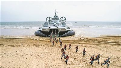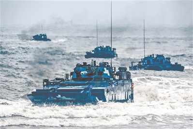 “我車泛水前準備完畢!”接到行動命令后,兩棲裝甲分隊迅速組成戰斗編波隊形,向岸灘發起沖擊。與此同時,搭載兩棲裝甲車和陸戰隊員的氣墊艇正高速航渡。隨著泛水編隊和氣墊艇相繼抵灘,裝甲車掩護步兵迅速搶占灘頭有利陣地,向目標縱深地域發起攻擊。