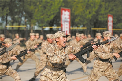刺殺課目訓練中,新兵黨員斗志昂揚。