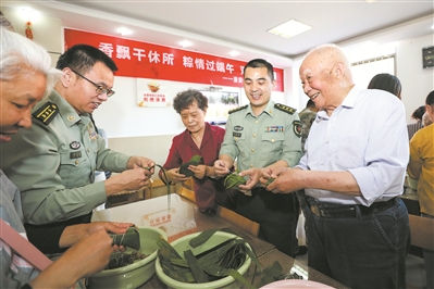 5月30日,江蘇省軍區淮安離職干部休養所舉辦喜迎端午活動,官兵與老干部及家屬一起包粽子、畫彩蛋,體驗傳統民俗,共慶佳節。 趙啟瑞攝