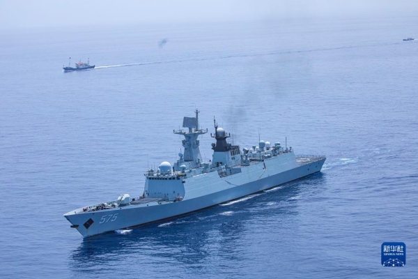 中國海軍第40批護航編隊中的岳陽艦在執行護航任務(6月4日攝)。新華社發(楊捷 攝)