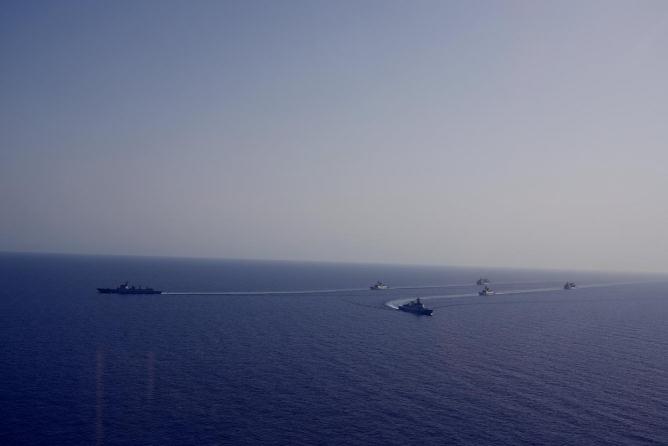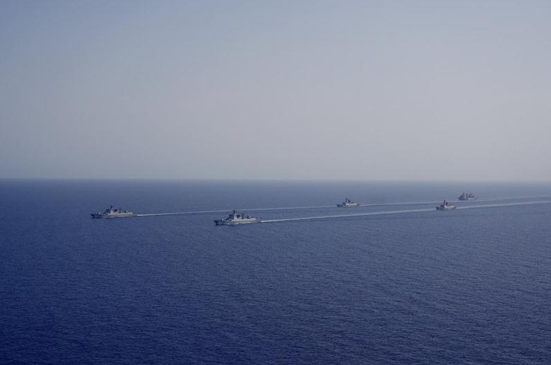 中國海軍第40、41批護航編隊艦艇組成雙縱隊。田健敏 攝