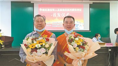 小小優待證,濃縮父子兩代軍旅情!皼]想到軍地領導對我們老兵群體這樣重視,沒想到我們父子脫下軍裝后還能迎來這樣的高光時刻!笔峙貂r花,身披綬帶,在現場雷鳴般的掌聲中,父子倆許下新的心愿:等下一代長大,也要把他們送入火熱軍營。(徐文濤)