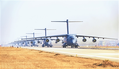 展望世界風云變幻,習主席發出“把人民空軍全面建成世界一流空軍”的偉大號召,人民空軍堅決響應統帥號令,戰略轉型由量變積累向質變跨越邁進。以運-20大型運輸機列裝為標志,我軍空中戰略投送力量奮飛前行,印著“八一”軍徽的運-20,飛越大洋、飛越高山,飛越時區、飛越經緯,出現在喀布爾國際機場、努庫阿洛法國際機場……