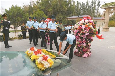 甘肅省軍區第4教育協作區的現役官兵、文職人員在酒泉衛星發射中心向東風革命烈士紀念碑獻花。胡順順攝