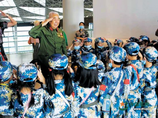 巧合的是,在博覽中心紀念東征軍革命烈士展館內,一群正在接受國防教育的祖國花朵,與干休所的老干部不期而遇。干休所政委黨智當即決定,邀請老兵現場為這群“小小兵”講述革命傳統故事。孩子們歡呼雀躍,迅速圍攏在老兵身旁。