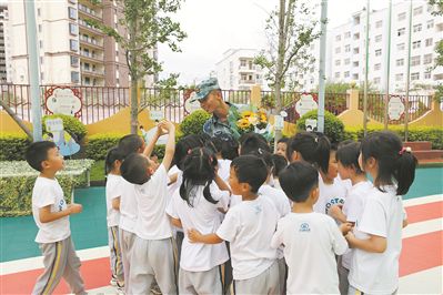 7月21日,南部戰區空軍某場站官兵來到駐地幼兒園開展“童心系國防 萌娃有擔當”主題共建活動。