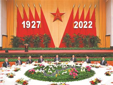 人民大會堂宴會廳燈火璀璨,洋溢著熱烈喜慶的節日氣氛。主席臺上方懸掛著莊嚴的“八一”軍徽,“1927-2022”的大字年號在紅旗映襯下格外醒目,昭示著中國人民解放軍走過95年的光輝歷程。