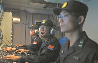 “戰斗警報!”正在臺島附近某海域執行警巡任務的海軍南京艦拉響戰斗警報,官兵立即進入戰斗狀態。作戰指揮室內熒屏閃爍,各戰位操作手緊盯屏幕、沉著應對。艦長馮宗彬告訴記者:“航行在這片海域,離祖國寶島這么近,我們深感責任重大、使命光榮,F在,全艦官兵士氣高漲、斗志昂揚!
