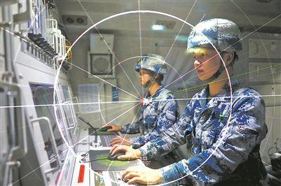 雷達操縱員研判空情,迅速捕獲“敵”目標。