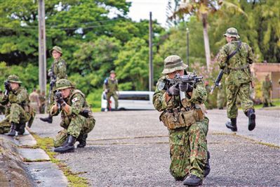 日本陸上自衛隊隊員在關島進行戰術演練。