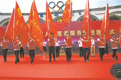 今年6月9日,益陽市為“軍魂”“紅娘子軍”“威龍”等11支市、縣(市、區)兩級退役軍人志愿者服務隊集中授旗,200余名退役軍人志愿者代表身著鮮艷的“紅馬甲”,邁著鏗鏘有力的步伐,從軍地領導手中接過鮮艷的旗幟。