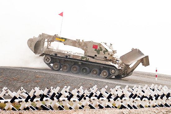 隨著裁判長一聲令下,第一組出場的中國車組和委內瑞拉車組迅速駛出,抵達彈坑路段后使用推土裝置展開緊張作業,中國參賽隊的清障車組率先通過開辟出的通路,精準完成木質堆垛的夾抓和放置,全速推開火障……