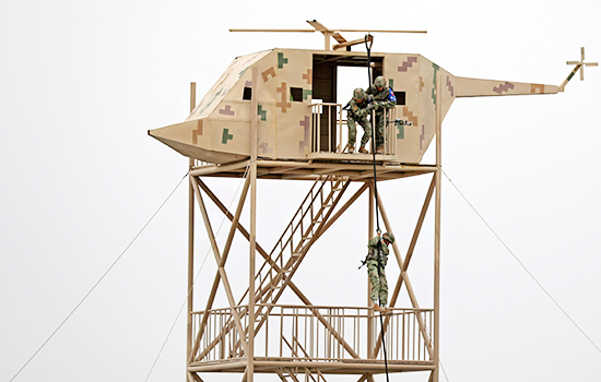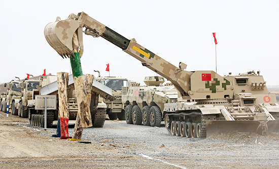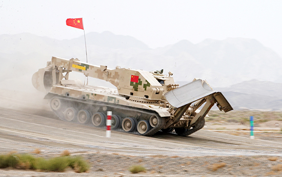 “安全路線”項目接力賽,旨在全面檢驗工兵分隊戰時機動和保障能力,按照突擊工兵班、架橋組、開路機組、清障車組編隊連貫實施,不設間隔和休息時間。各參賽隊要在2.5公里的環形封閉賽道上完成工程作業、實彈射擊、快速機動等內容。其中,架橋組在架設橋梁的同時,突擊工兵班模擬對架橋作業實施掩護展開實彈射擊。開路機組、清障車組隨后通過橋梁依次克服直行限制路、樁間轉彎限制路、土嶺、車轍橋等障礙,在完成相應的工程作業后,所有隊員駕乘車輛集體沖過終點。