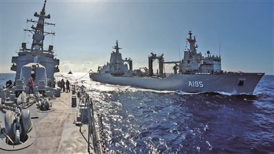 “環太平洋-2022”軍演期間,澳大利亞海軍補給艦(右)對日本海上自衛隊高波級驅逐艦進行補給。