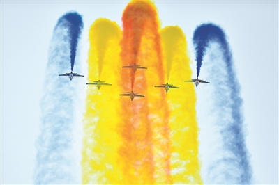 上圖:8月26日,在空軍航空開放活動暨長春航空展上,空軍航空大學“紅鷹”飛行表演隊進行飛行表演。