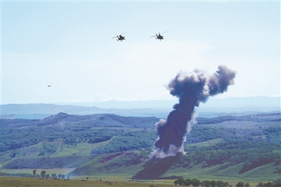 連續多日的暴雨結束后,謝爾蓋耶夫斯基訓練場天高云淡。中方空中戰術群數架殲-10B戰機與俄方偵察機、轟炸機聯合行動,高空對“敵”重要目標展開精確打擊;中方陸上戰術群數架直-10、直-19等直升機低空對“敵”實施密集火力打擊;中方陸上戰術群99型坦克、04A步戰車等陸上力量在山丘間卷起滾滾塵土,迅速突破“敵”陣地前沿;中方海上戰術群在日本海相關海域與俄方艦船聯合展開編隊航行、摧毀浮雷等科目演練。