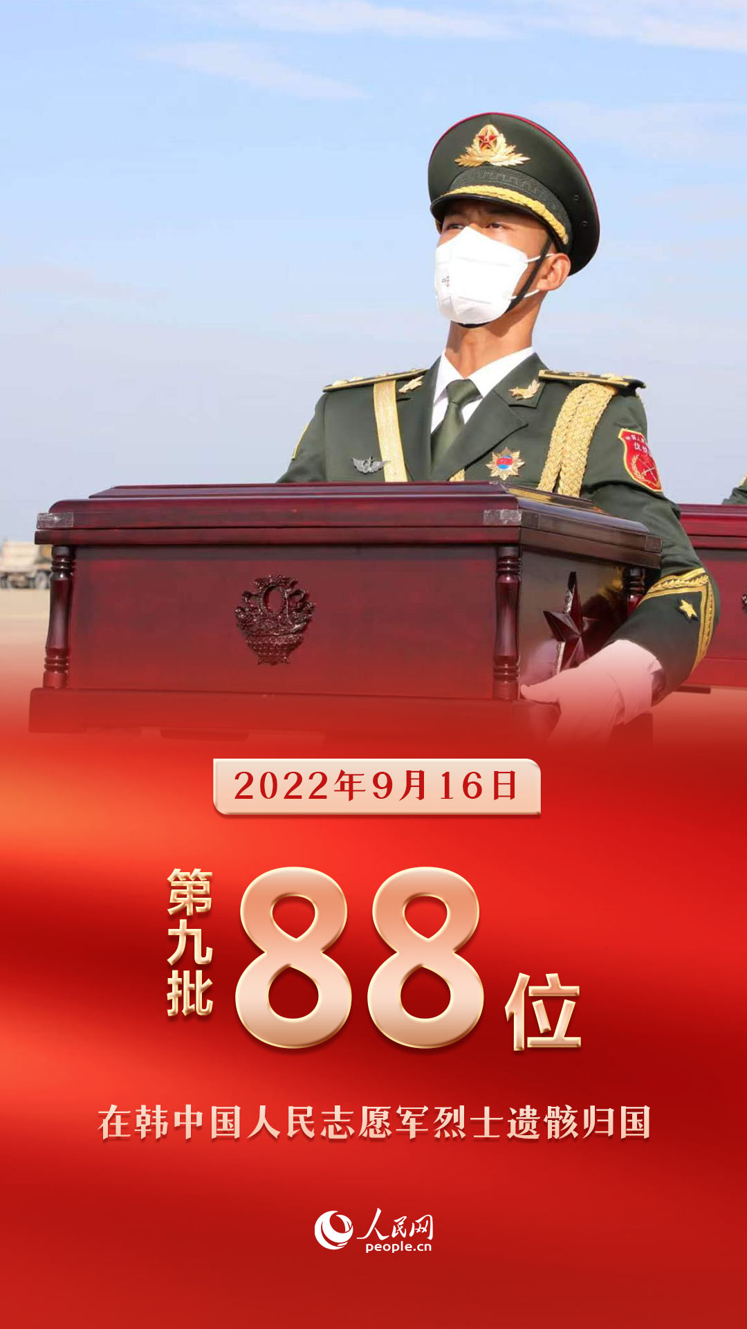 9月16日,第九批在韓中國人民志愿軍烈士遺骸歸國,88位烈士的遺骸及相關遺物回歸祖國懷抱。中韓雙方遵循人道主義原則,本著坦誠友好、務實合作精神,從2014年至2022年已連續9年成功交接913位在韓中國人民志愿軍烈士遺骸。只要我們記得,他們就活著。出征少年身,歸來英雄魂,向最可愛的人致敬!