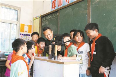“老師,這個手榴彈威力有多大?”“這個叫67式木柄手榴彈,重600g,有效殺傷半徑7米,爆炸時間3到3.7秒!9月1日,安徽省蒙城縣小澗鎮郭店小學,上課鈴聲剛響,學生們便圍在兵老師牛效力身邊,聚精會神地聽他介紹武器知識。這是安徽省蒙城縣選拔優秀退役軍人走進中小學開展國防教育的一個鏡頭。
