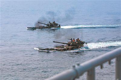 經過10多個小時機動,編隊次日清晨抵達新的演練海域!暗顷懕核详!”隨著指揮員下達指令,各艦艇塢艙內的兩棲戰車發出陣陣轟鳴聲,隨即開始泛水編波,在直升機掩護下向岸灘發起沖擊。頃刻間,灘頭陣地炮聲隆隆,煙塵飛揚。
