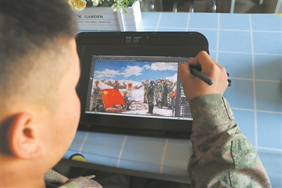 戰士利用電子設備創作愛黨愛國題材繪畫作品。