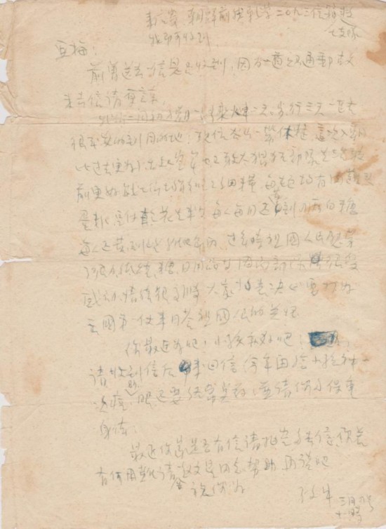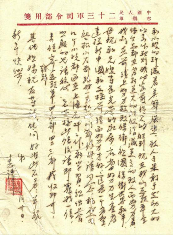 “現時敵我相持于固定的戰線,日有小接觸,我們不斷殺傷和小股殲滅著美寇強盜。敵人于(如)果敢于發動大的攻擊作戰,則我必定獲得大的勝利,F在我們志愿軍全體同志都在為打更大的勝仗,消滅更多的敵人而努力著。我們在前線上努力殺敵保衛祖國,保衛世界和平。母親和兄嫂等是光榮的家屬,應當努力生產為建設新中國和支援前線而努力才好,這是一個希望!
