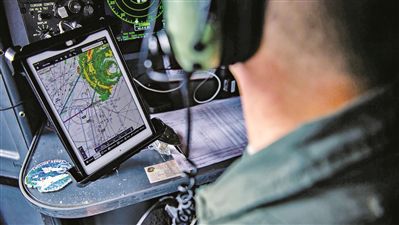 美空軍國民警衛隊人員使用電子設備追蹤颶風。