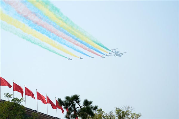 2019年10月1日上午,慶祝中華人民共和國成立70周年大會在北京天安門廣場隆重舉行。這是領隊機梯隊拉出絢麗的彩煙。 新華社記者 李剛 攝