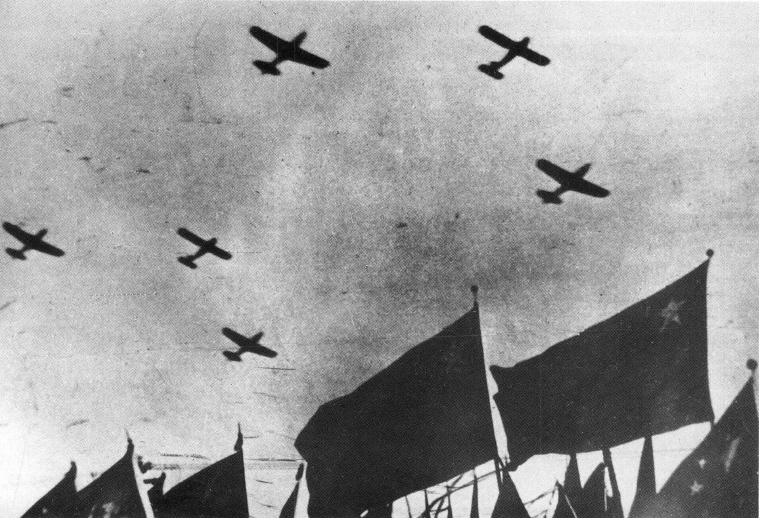 1949年10月1日,中華人民共和國開國大典閱兵,17架飛機組成的飛行編隊飛過天安門廣場上空。新華社發