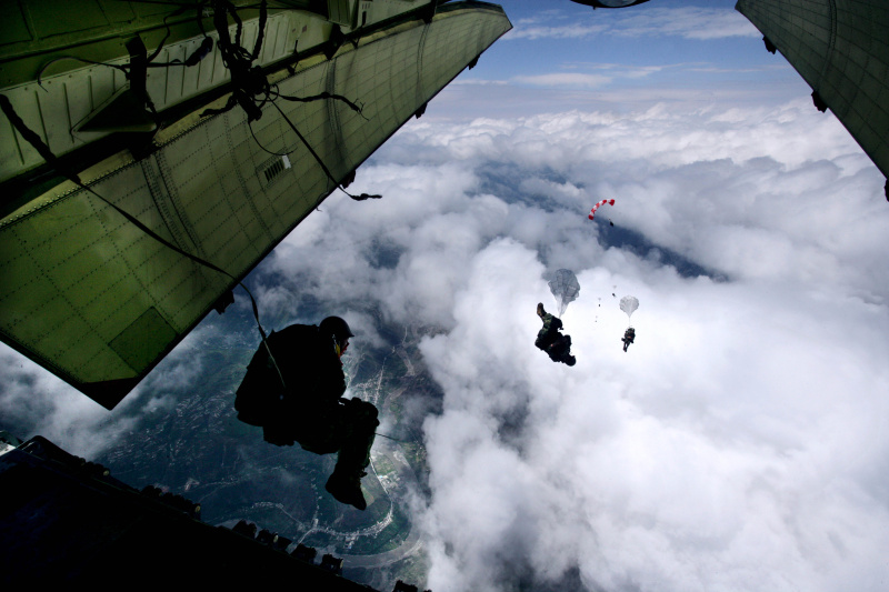 2008年5月14日,15名空降兵從地震災區四川茂縣上空4999米的高空奮不顧身跳下,進入道路阻斷的災區參加救援。新華社發 劉應華 攝