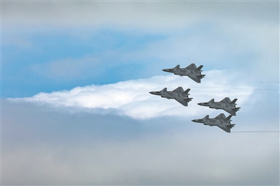 上圖:11月11日,殲-20戰機四機編隊在第十四屆中國航展上進行飛行展示。新華社發