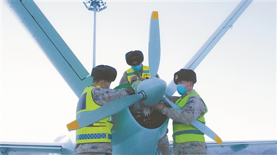 新疆軍區某旅無人機偵察一連機務人員起飛前檢查飛機。 謝亮攝