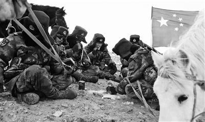 來軍校讀研究生時,朱允來帶上了一張照片。照片上是莽莽雪原,他和戰士們席地而坐吃著干糧,身旁是高大的軍馬和飄揚的五星紅旗。如果不是朱允來自己說左邊第4個是他,單從照片上被陽光曬得黑里透紅的皸裂的臉龐,似乎很難認出。