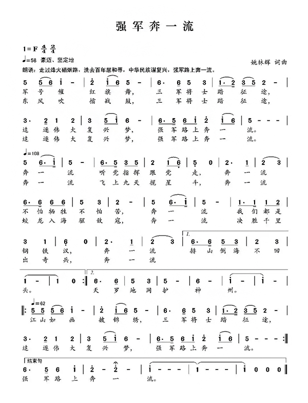 黨的二十大吹響了加快把人民軍隊建成世界一流軍隊的催征號角,人民軍隊聞令而動,朝著建軍一百年奮斗目標勇毅前行。“號角響,旌旗奮,三軍將士踏征途,追逐偉大復興夢,強軍路上奔一流”。由南部戰區陸軍政治工作部出品,著名歌唱家閻維文、姚林輝演唱,姚林輝作詞作曲的作品《強軍奔一流》,通過人民軍隊以排山倒海之勢奮楫強軍的恢宏場景,展現廣大官兵聽黨指揮、敢打必勝的英雄氣概。