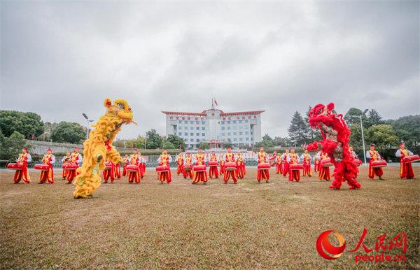 伴隨著喜慶的鑼鼓聲,一條五彩祥龍從方隊中間穿梭而出,巨龍在官兵們手中舞動得活靈活現,形態變化萬千。游玩的官兵紛紛駐足觀看,歡呼聲、掌聲匯聚成一片歡快的海洋。